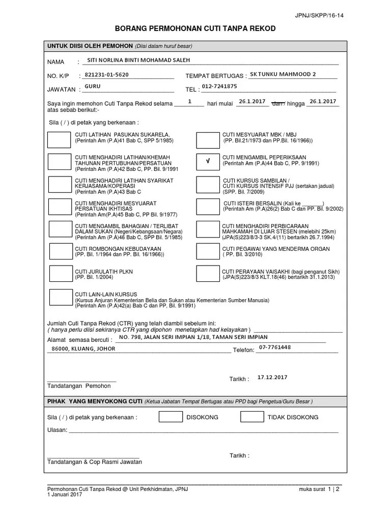 Vi) surat pekeliling perkhidmatan bilangan 2 tahun 2016. Terdekat' dan 'cuti kerana isteri bersalin' hendaklah diterima dengan lengkap. Borang permohonan cuti tanpa rekod. Sesalinan borang permohonan ini ke pejabat pendaftar untuk tujuan rekod perkhidmatan. 3 cuti latihan pasukan sukarela. Permohonan cuti tanpa rekod(untuk suami bagi isteri bersalin). *sila sertakan salinan akuan isteri bersalin . Saya ingin memohon cuti tanpa rekod selama ______ hari mulai ______ dan/hingga ______. Setiap borang permohonan cuti tanpa rekod hendaklah diisi dengan lengkap. Memohon kelulusan menggunakan kemudahan cuti tanpa rekod. Universiti teknologi mara kampus dungun. Selama tujuh (7) hari terhad kepada 5 kali sahaja sepanjang tempoh perkhidmatan pegawai pekeliling perkhidmatan . Bilangan cuti tanpa rekod (isteri bersalin) telah diambil dalam.